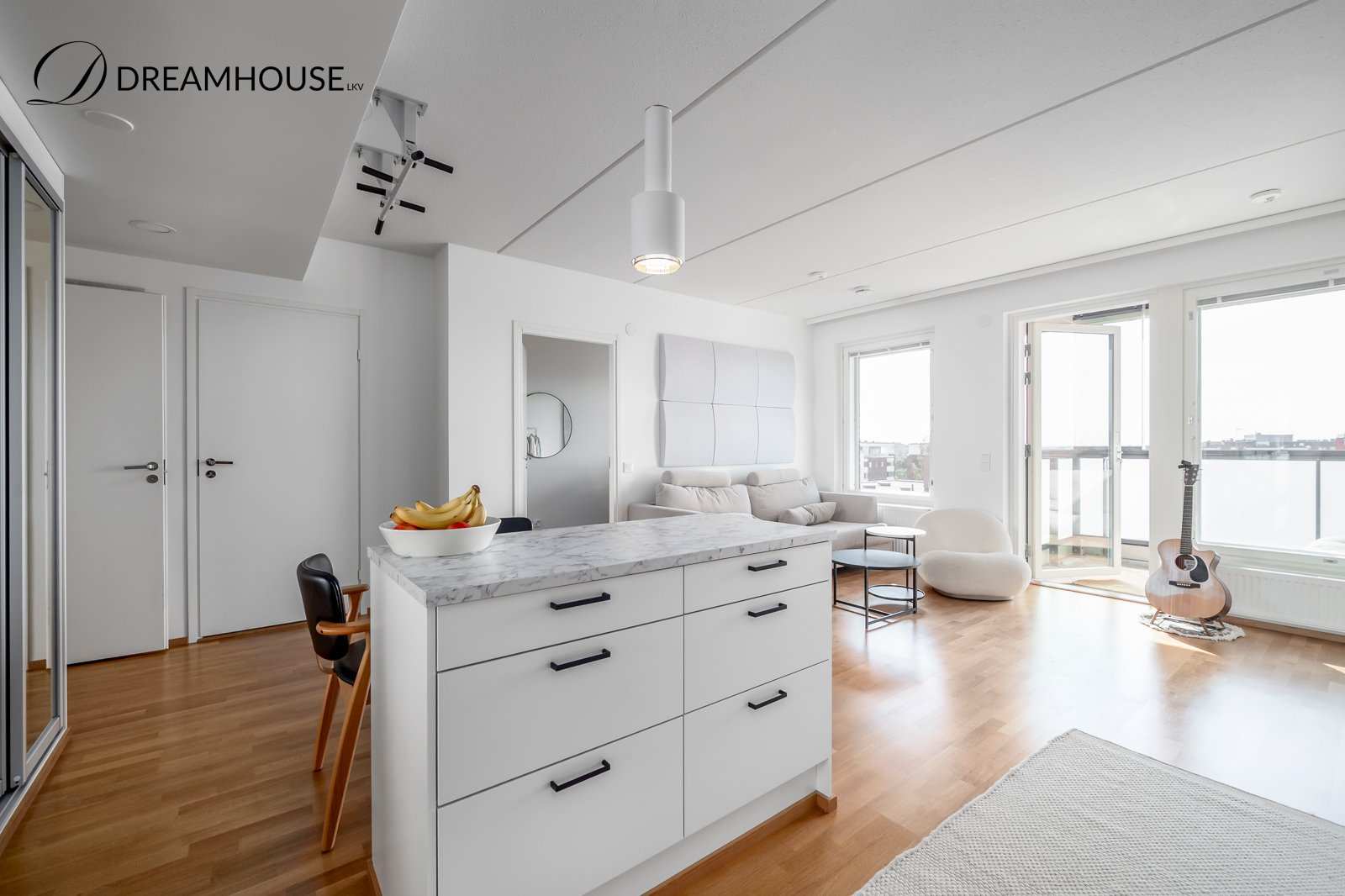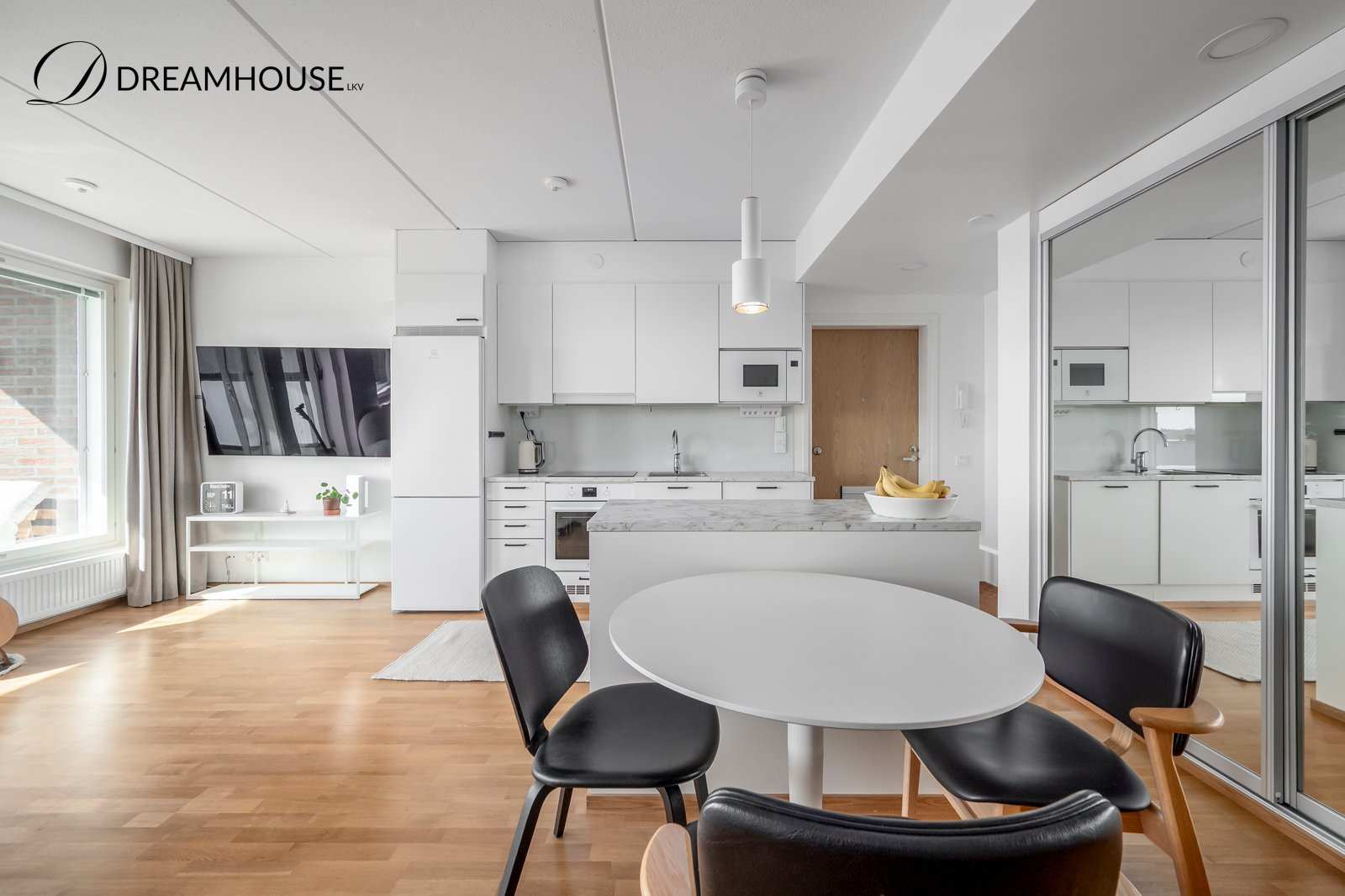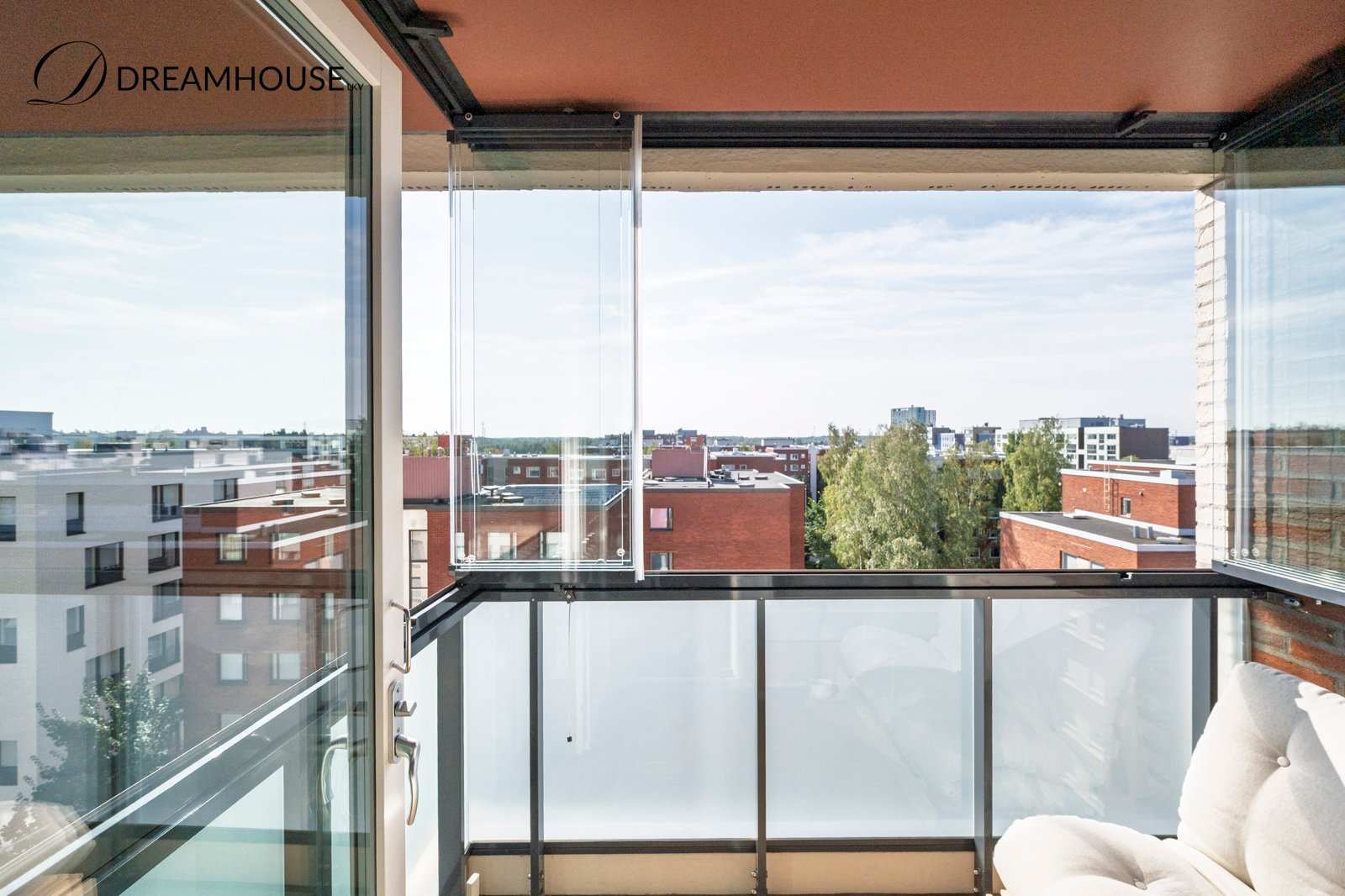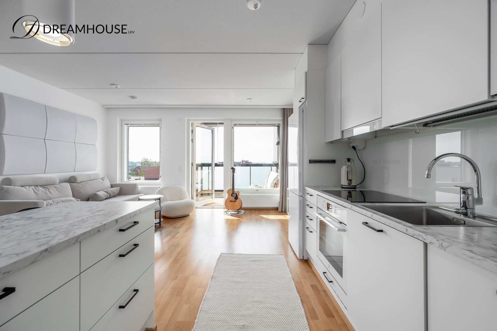 Tilavan olohuoneen yhteydessä moderni avokeittiö, jossa on laadukkaat kodinkoneet sekä käytännöllinen keittiösaareke. Lasitetulla parvekkeella voit nauttia aamukahvit tai rentoutua pitkän päivän päätteeksi.