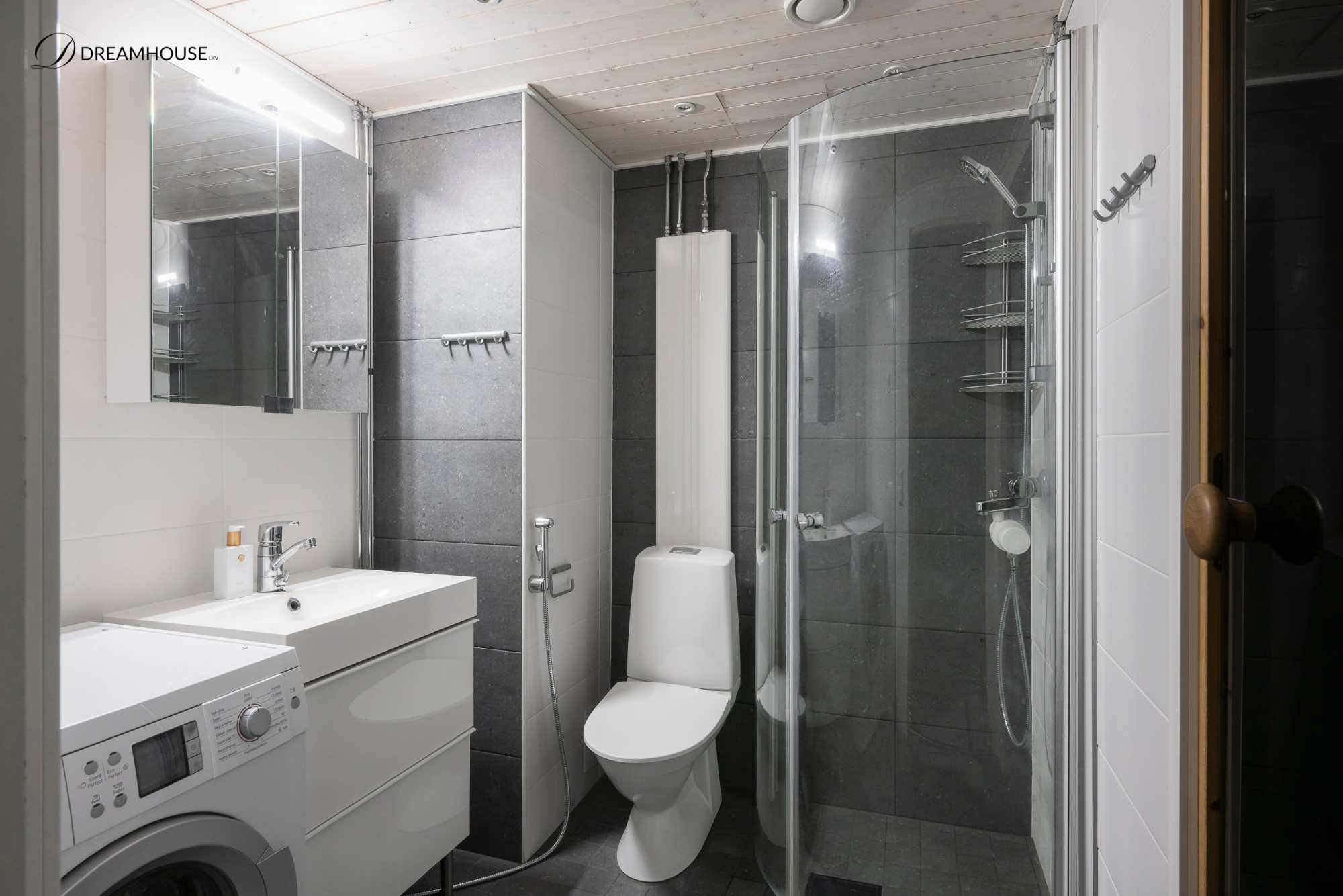 | Kylpyhuoneen varusteet | WC-istuin, suihku, suihkuseinä, pesukoneliitäntä, pesuallas, allaskaappi, bidee-suihku ja peilikaappi |