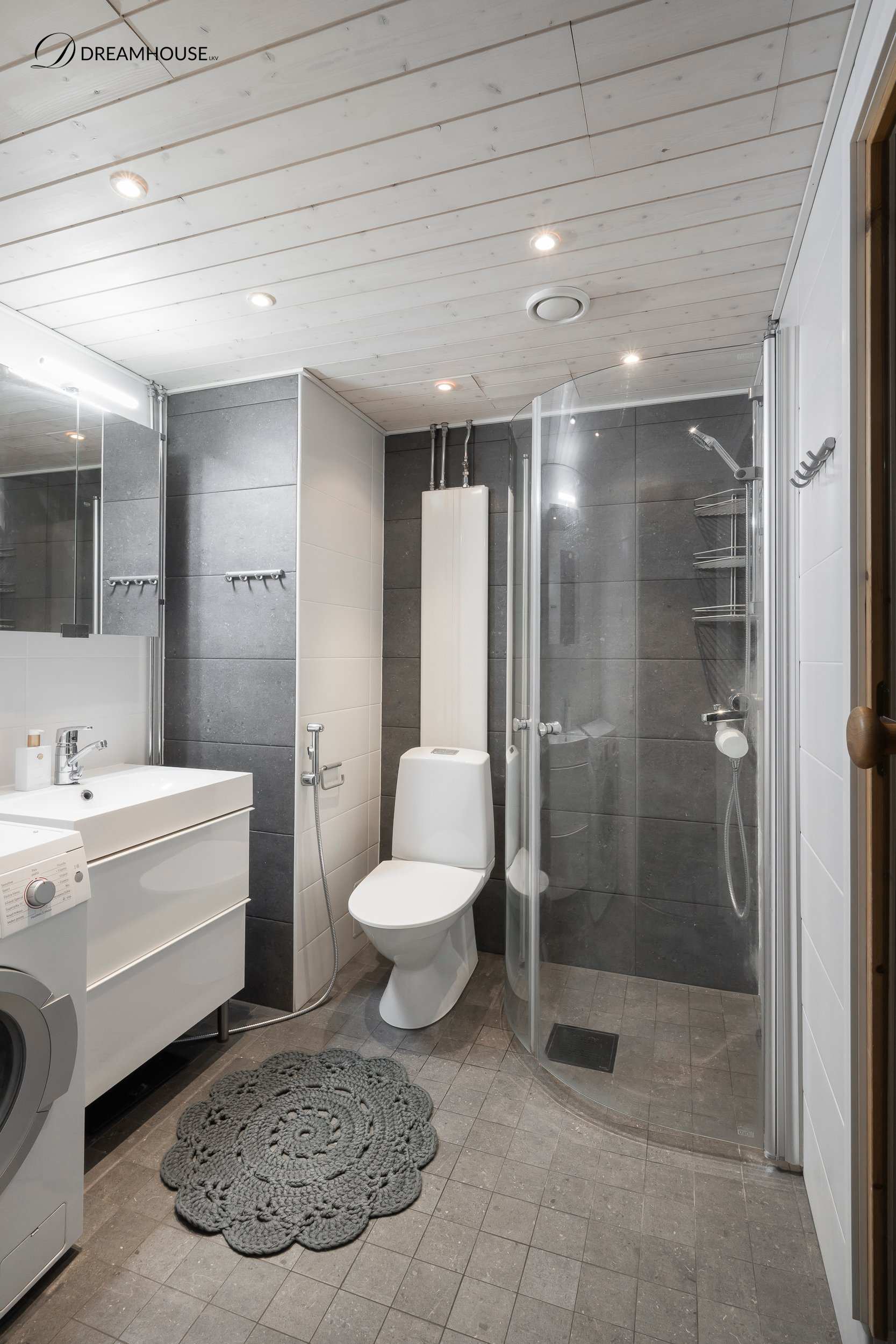 Remontoitu kylpyhuone on tyylikäs ja harmoninen jossa tilaa on myös esimerkiksi pesutornille. Oma sauna tuo ripauksen luksusta arkeen.
