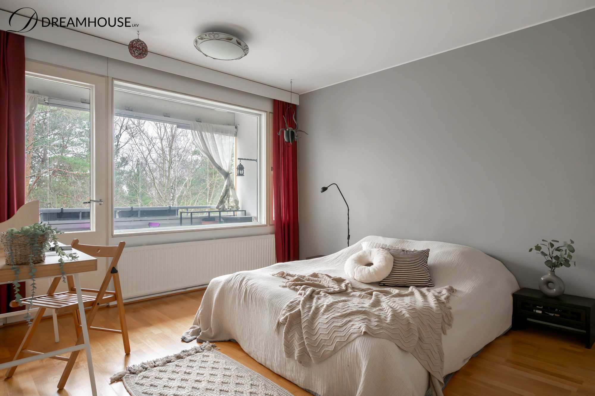 Ylimmän kerroksen valoisa ja lämminhenkinen kolmio tarjoaa kodikkaan pesäpaikan rauhallisen ja vehreän Pihlajamäen sydämessä. Asunnossa on kaksi isoa makuuhuonetta ja molemmissa on oma vaatehuone, käytännöllinen keittiö, kylpyhuone ikkunalla sekä lasitettu parveke, jolta avautuu rauhoittava metsänäkymä. Ikkunoista tulvii luonnonvaloa, ja näkymät tuovat ripauksen luonnon rauhaa osaksi arkea.