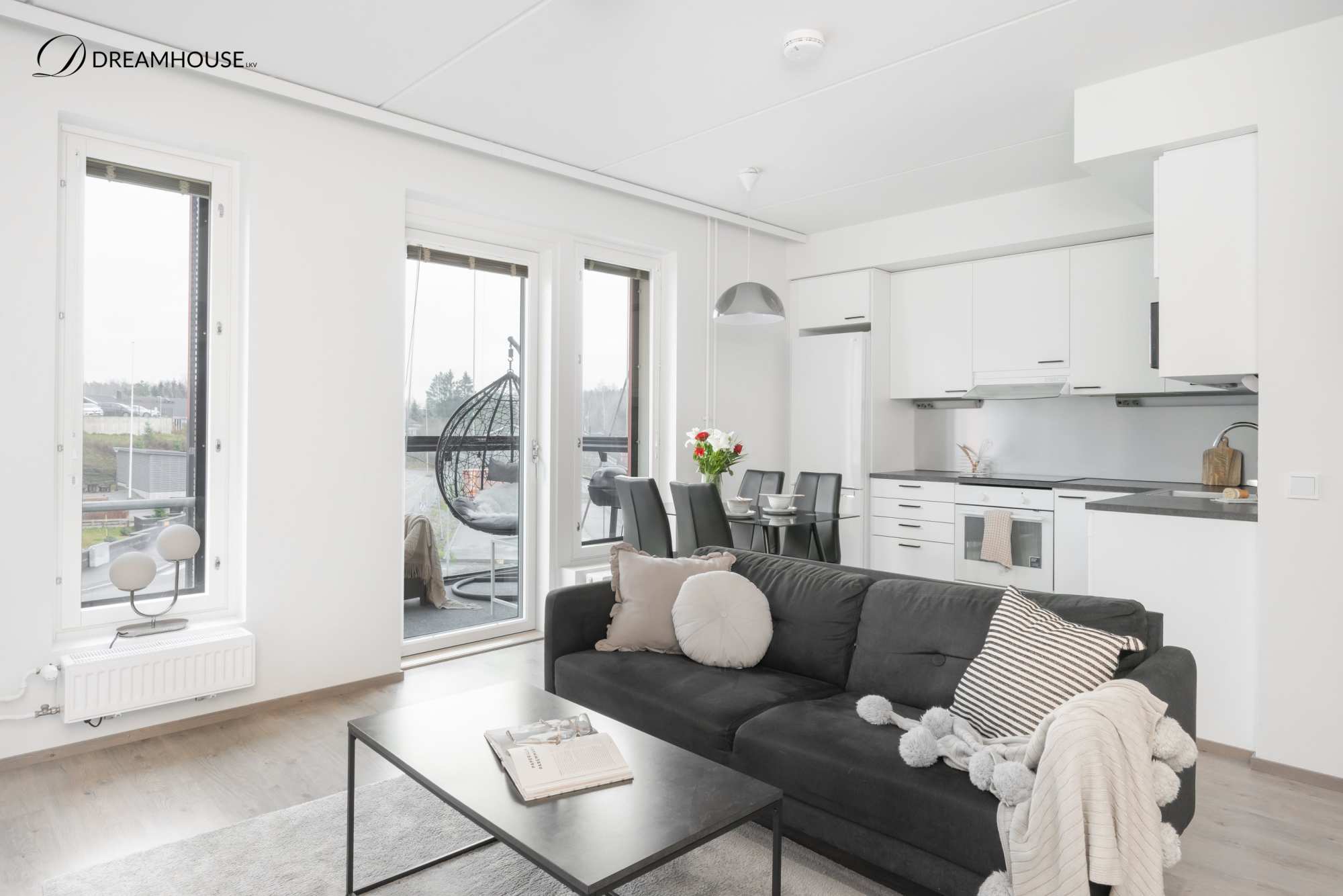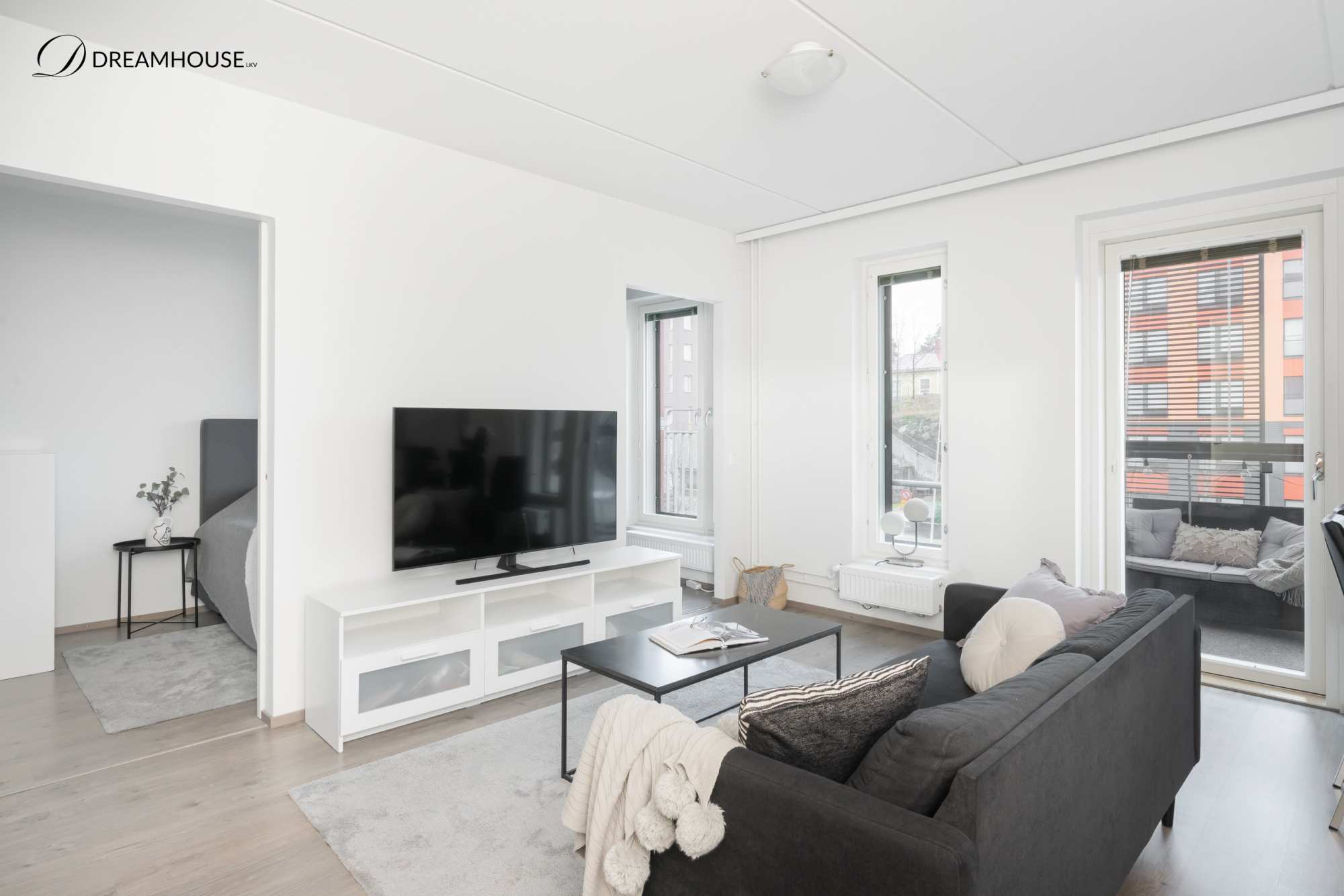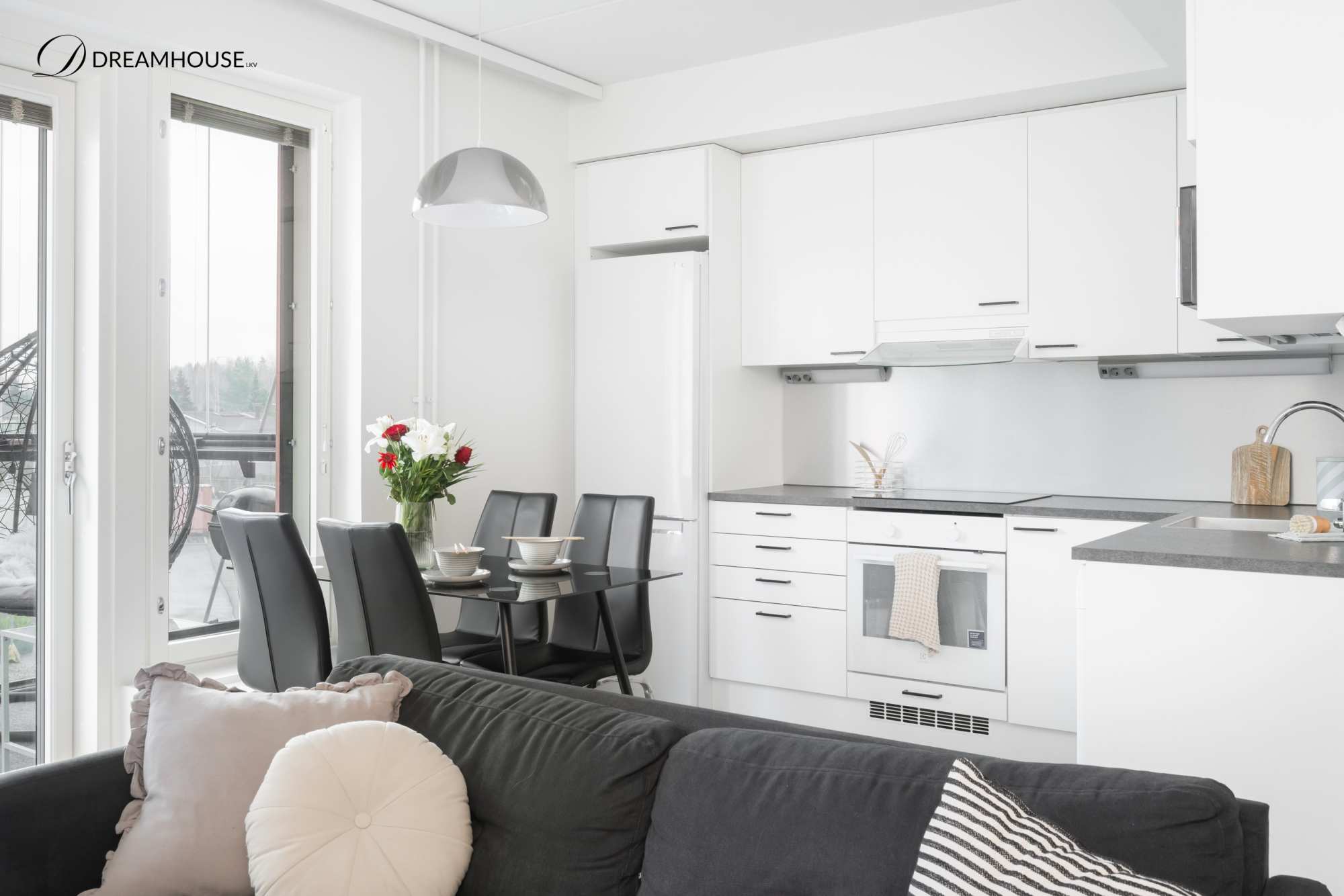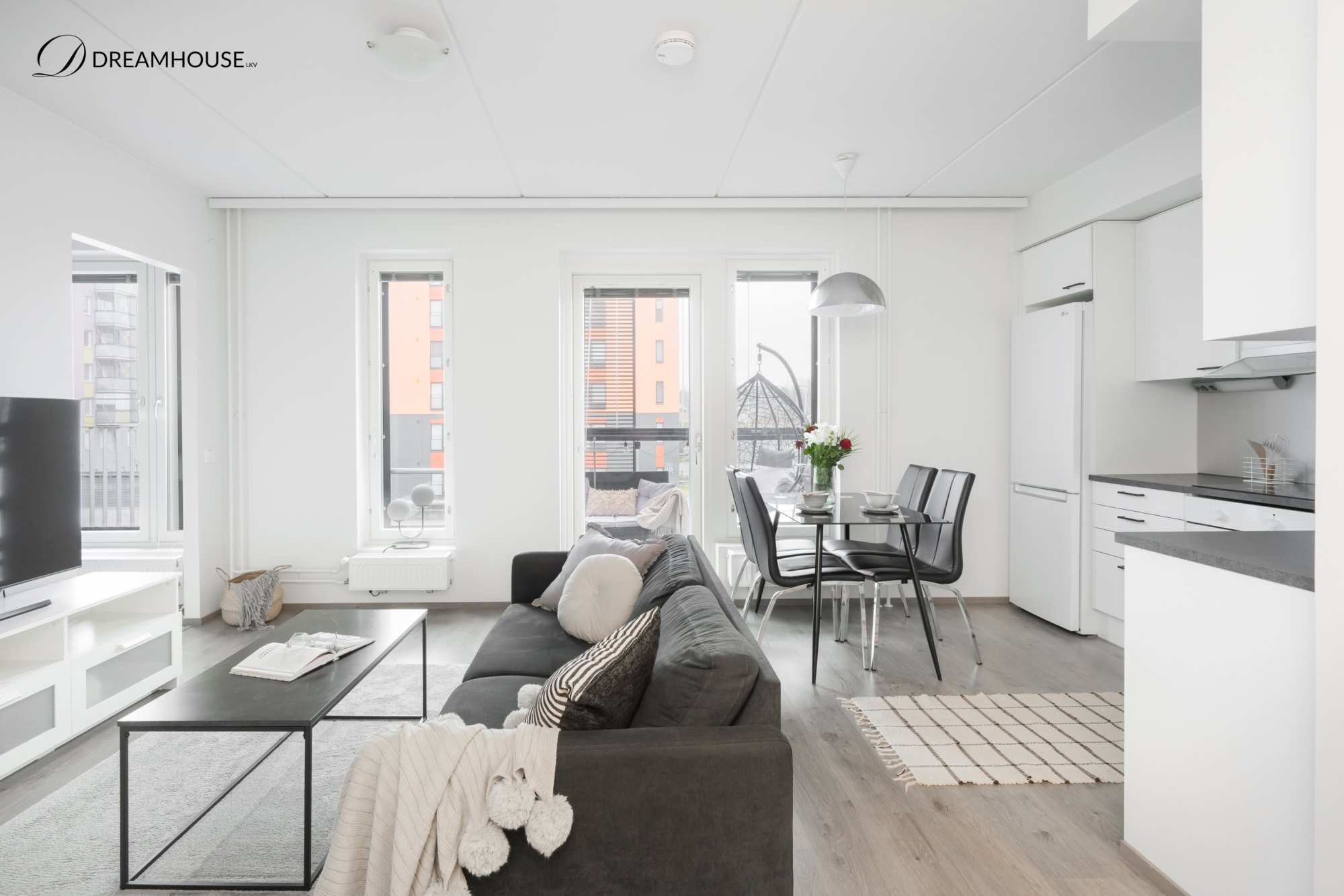 Asunnon valoisa olohuone sekä käytännöllinen keittiö muodostavat viihtyisän yhtenäisen tilan. Lisäksi asunnon suuret ikkunat, iso vaatehuone ja tilava lasitettu parveke mahdollistavat toimivan ja helpon arjen eri elämäntilanteessa olevalle.