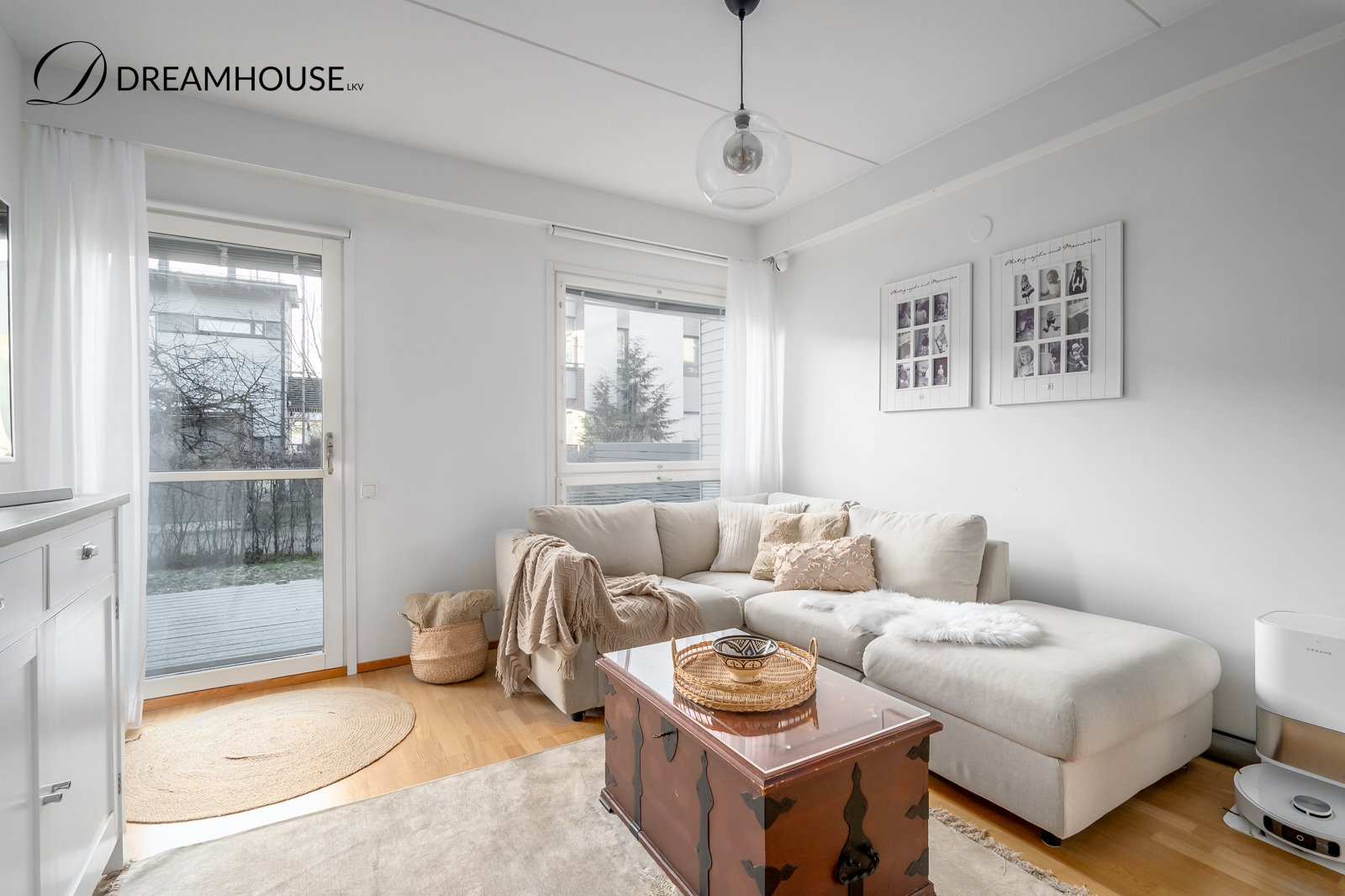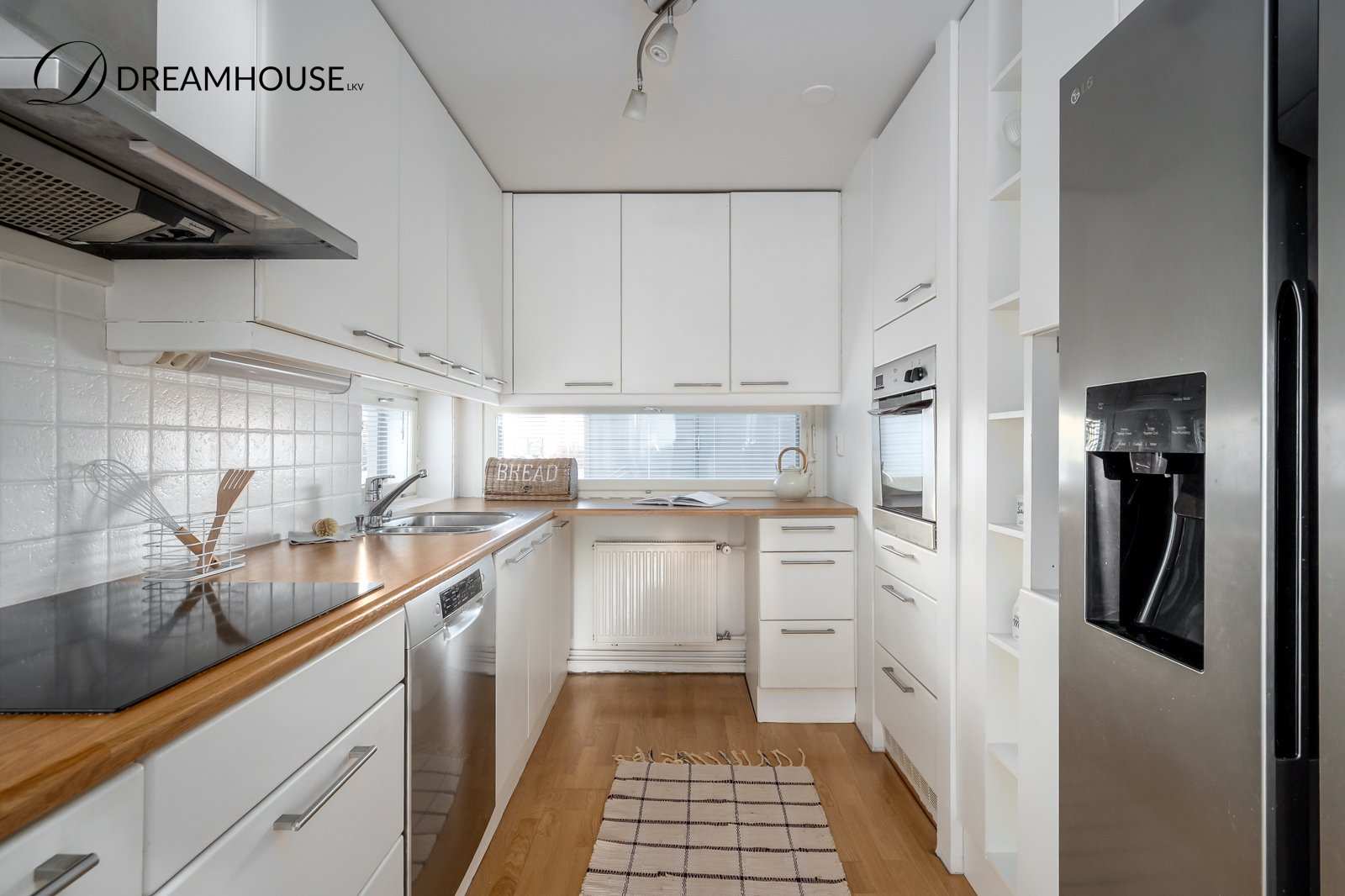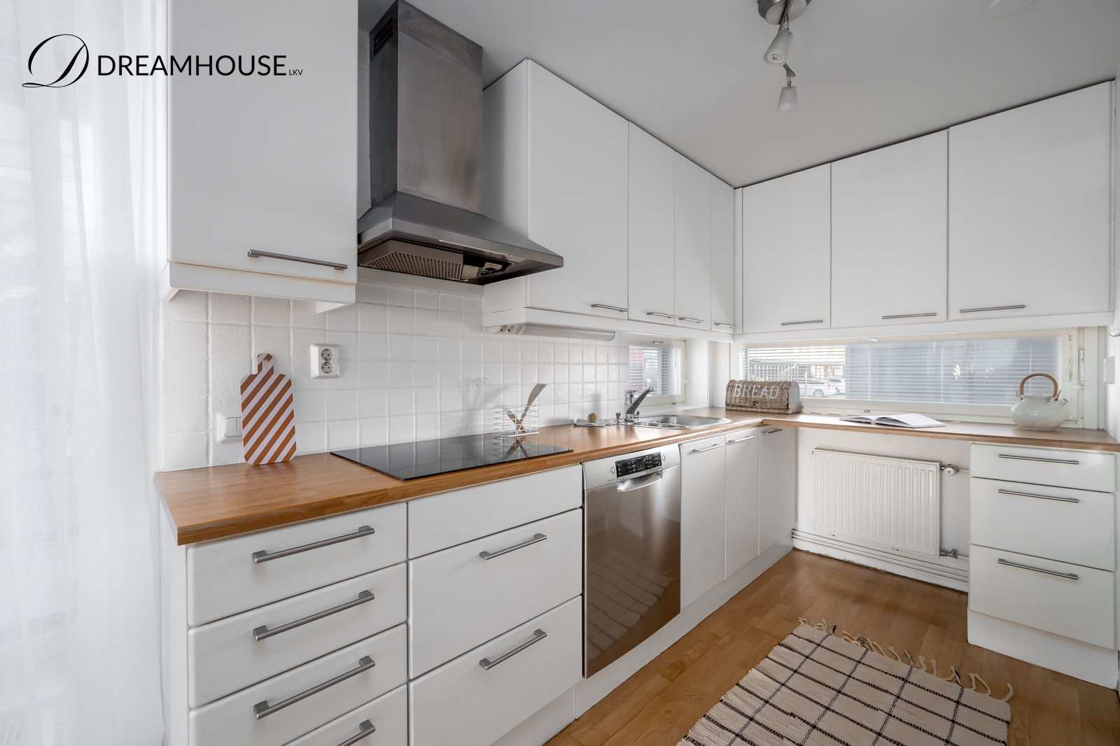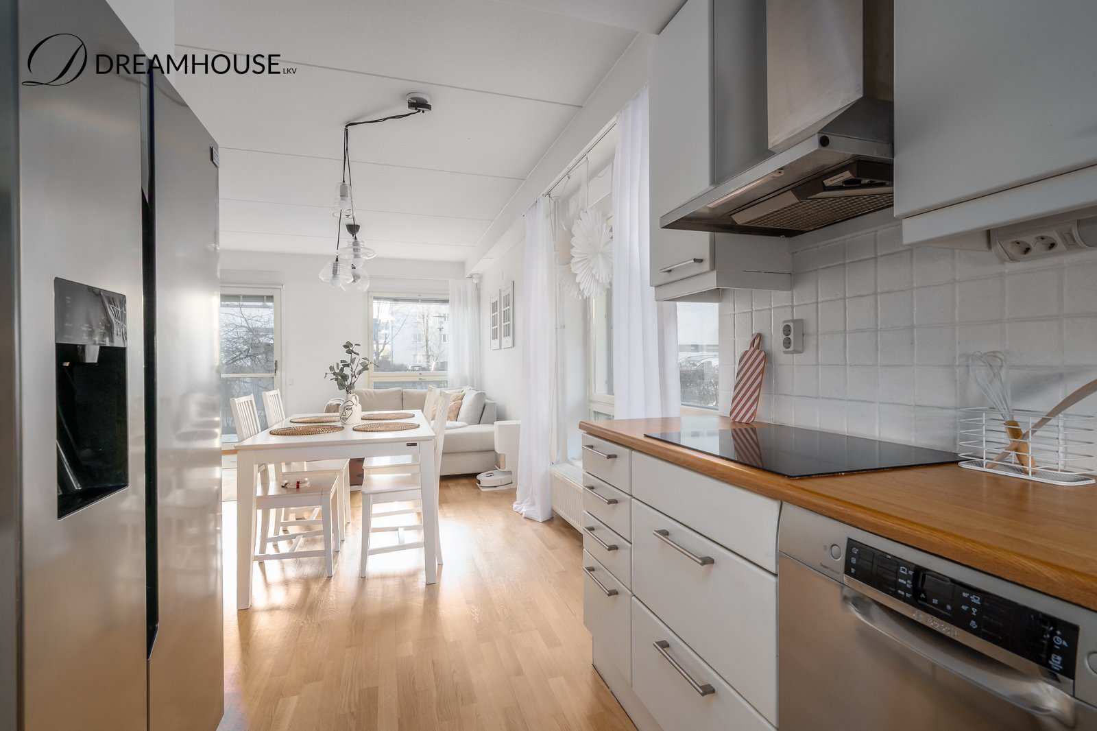 Sisääntulokerroksessa tyylikkäästi uusittu keittiö kodinkoneineen. Olohuoneesta käynti omalle etelän suuntaan olevalle takapihalle jossa iso terassialue sekä sähköinen markiisi. Alakerrasta löytyy lisäksi erillinen wc sekä makuuhuone.
