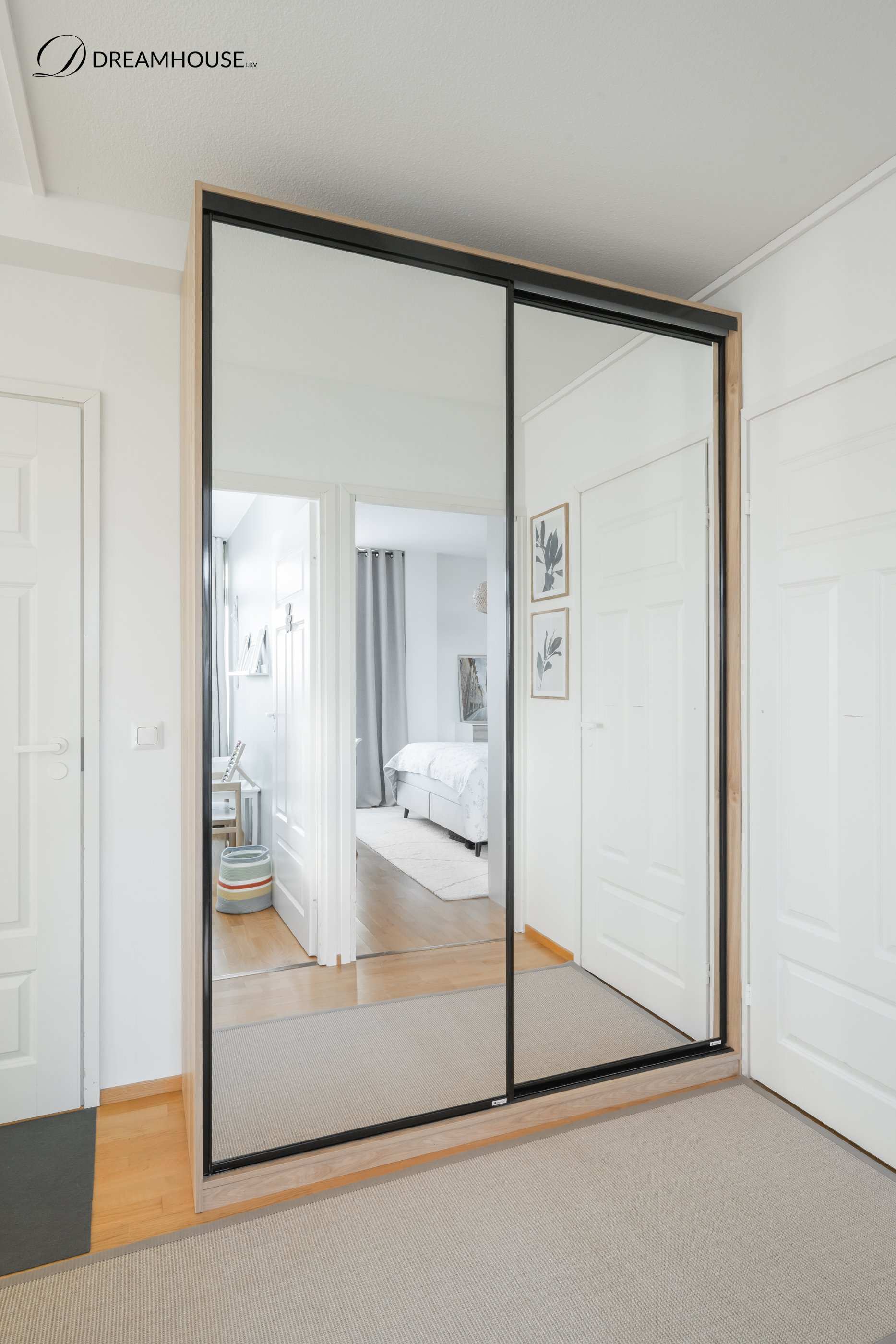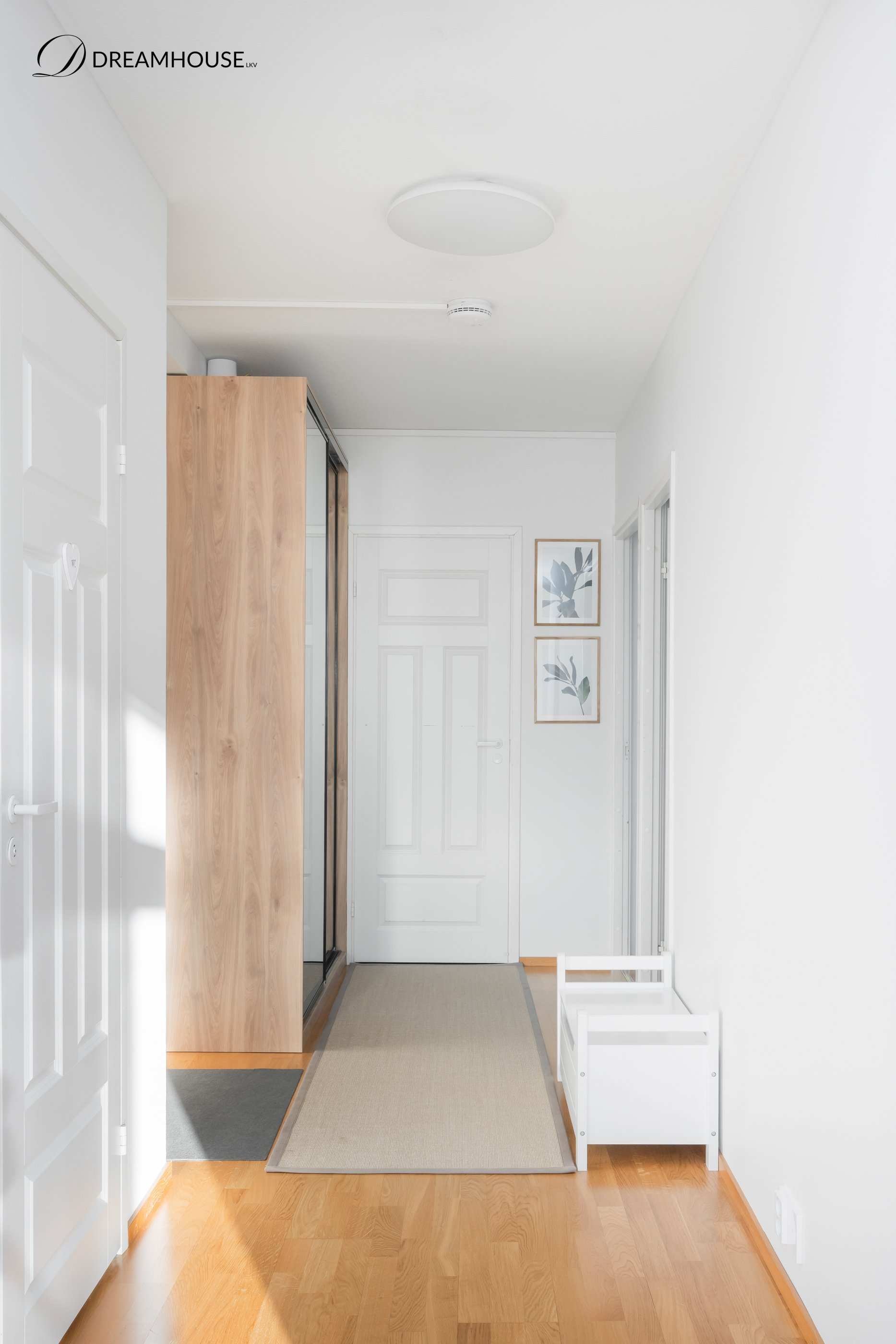 Eteisessä on runsaasti säilytystilaa, sillä eteiskaapistojen lisäksi lisätilaa on vaatehuoneessa. Asunnon kaksi makuuhuonetta sijaitsevat omassa rauhassaan eteisen puoleisessa päädyssä. Kylpyhuoneen vieressä on erillinen wc.