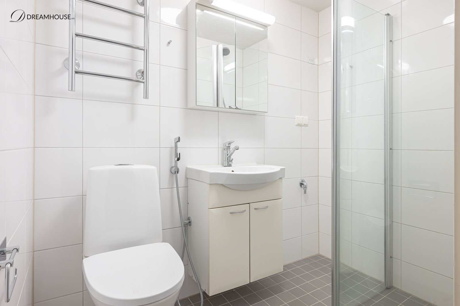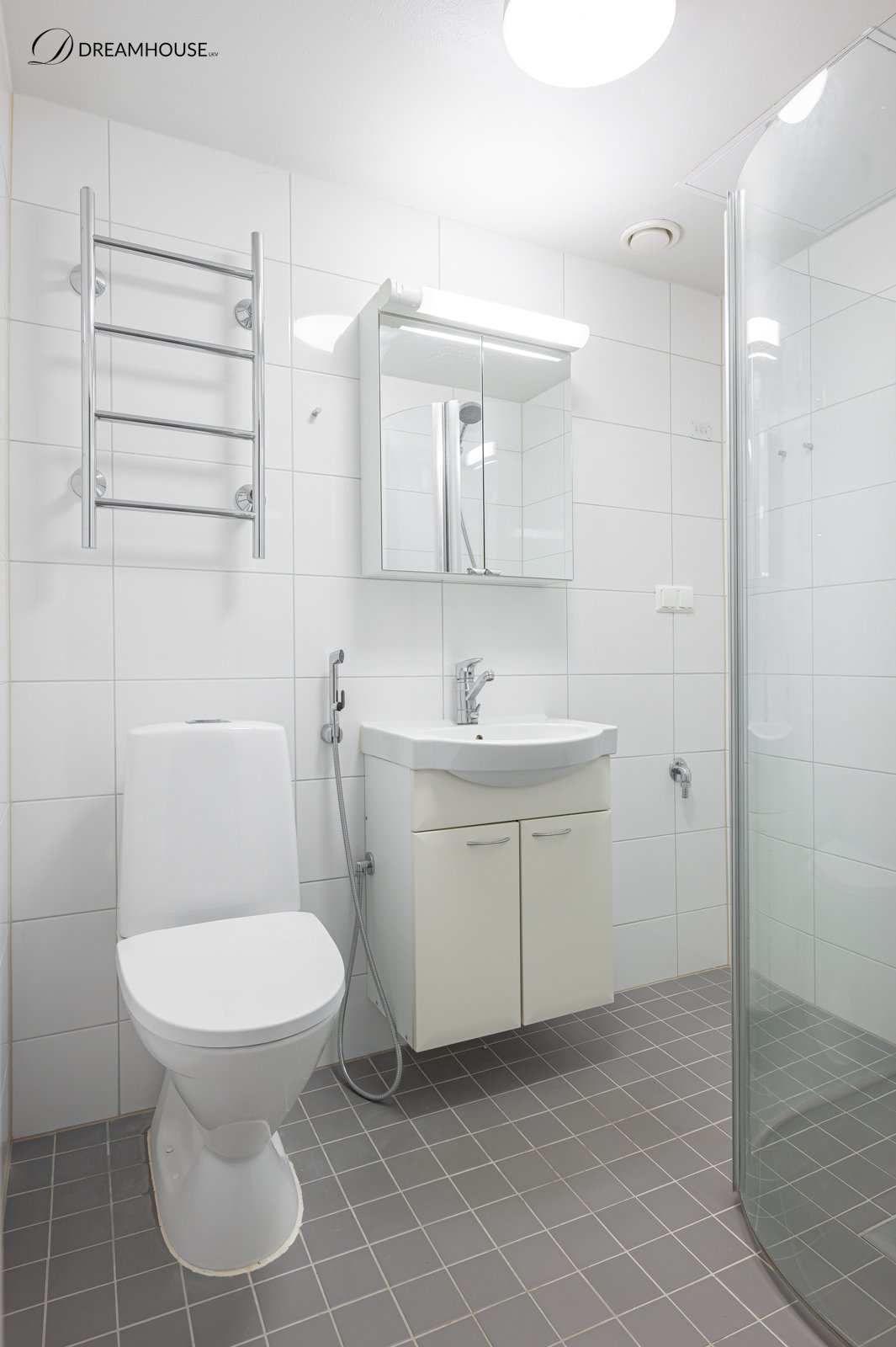 | Kylpyhuoneen varusteet | WC-istuin, suihkuseinä, pesukoneliitäntä, peilikaappi, pesuallas, allaskaappi, bidee-suihku, suihku, lattialämmitys ja rättipatteri |