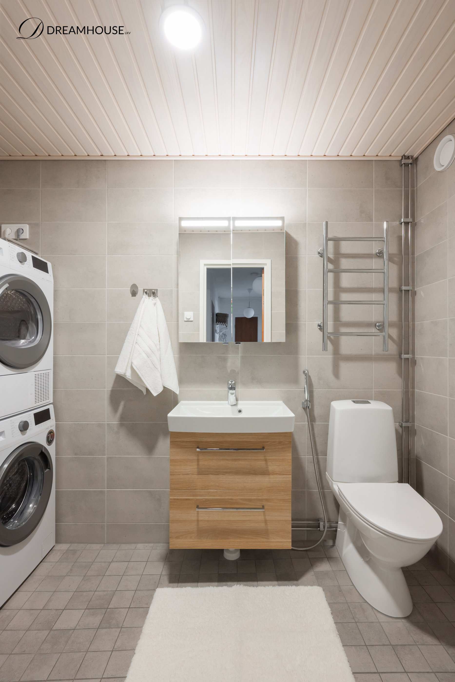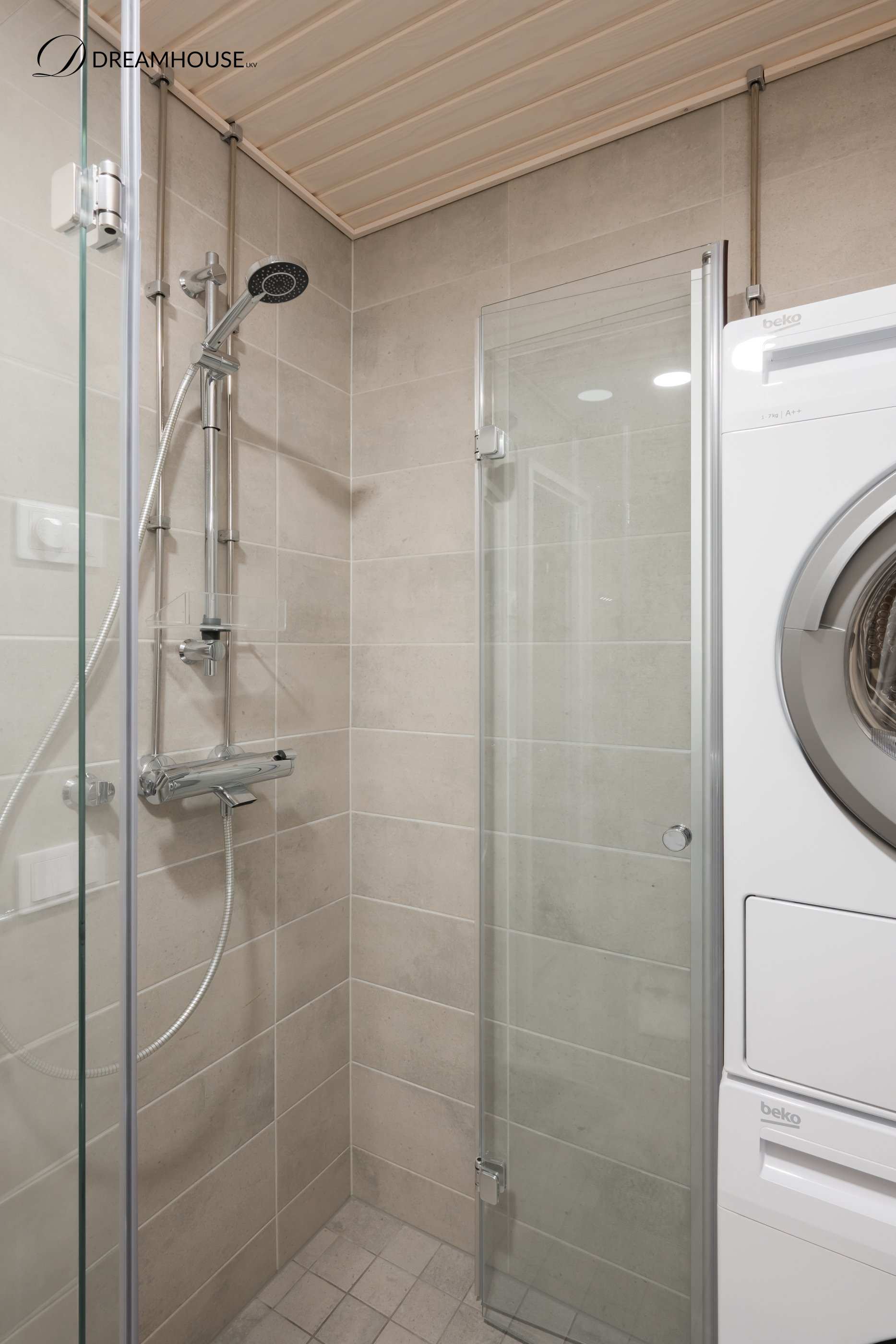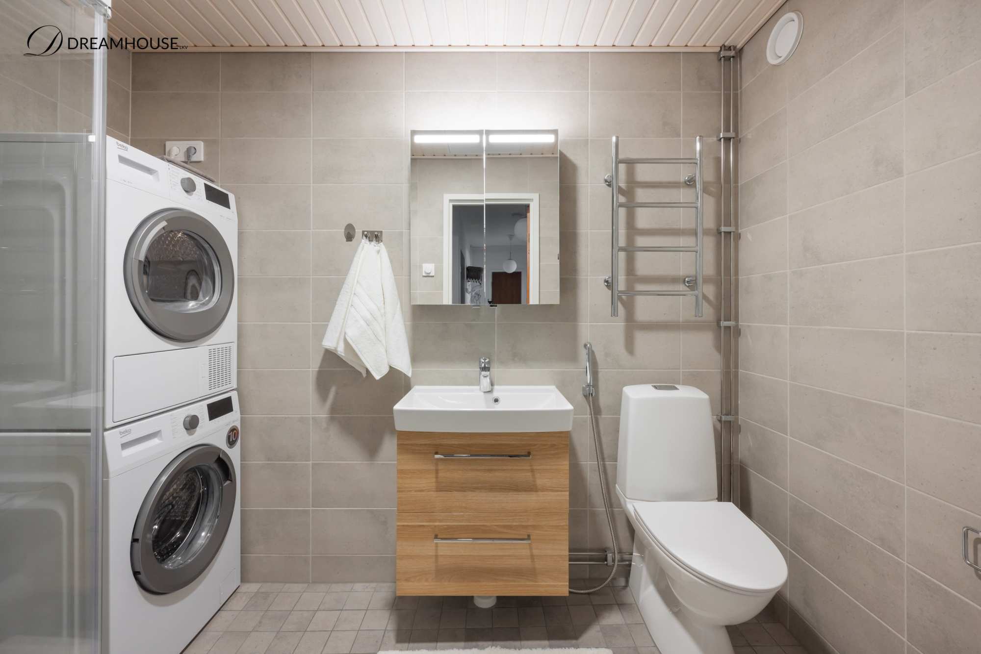| Kylpyhuoneen varusteet | Suihku, wc-istuin, suihkuseinä, lattialämmitys, peilikaappi, pesuallas, allaskaappi, bidee-suihku ja pesukoneliitäntä |