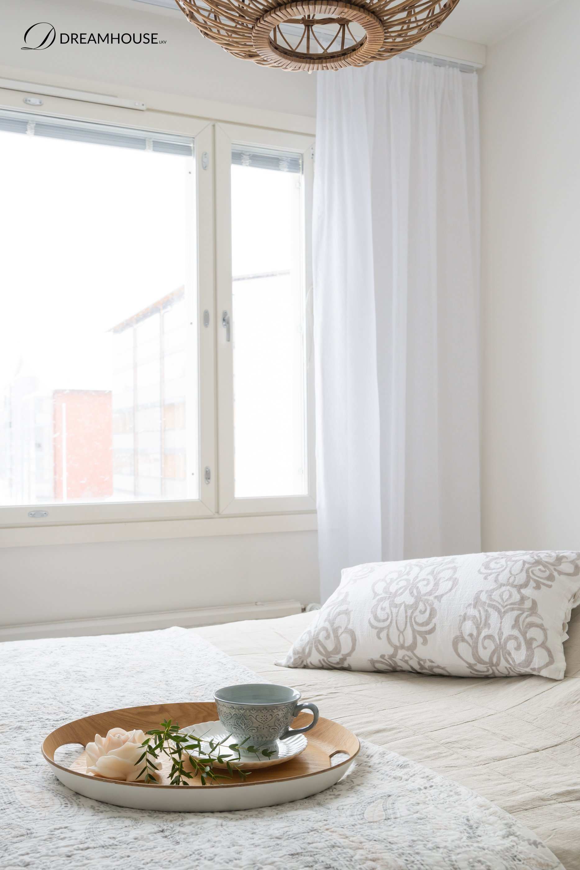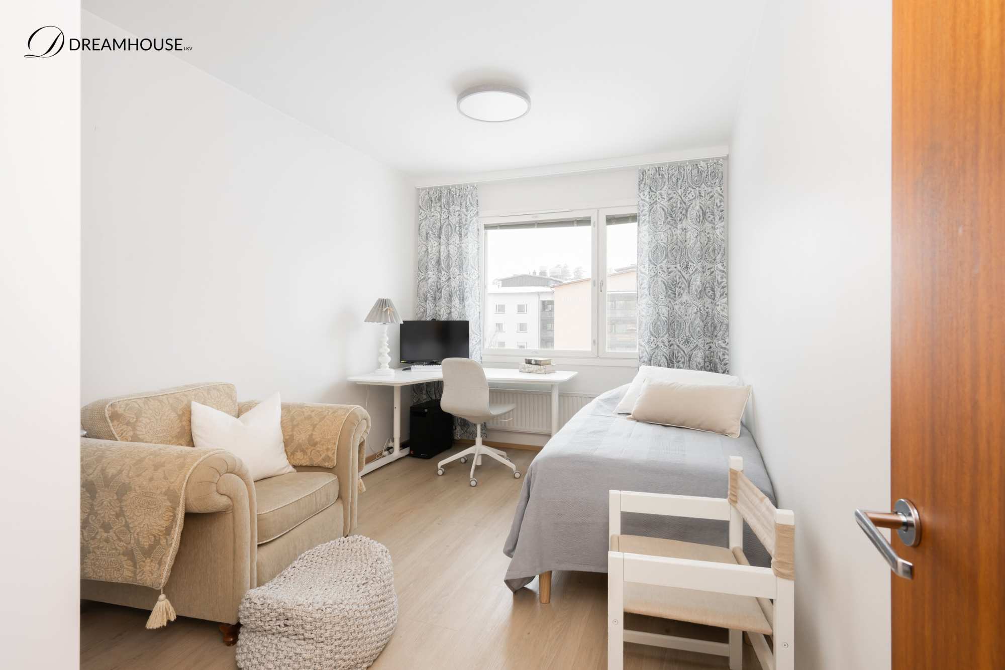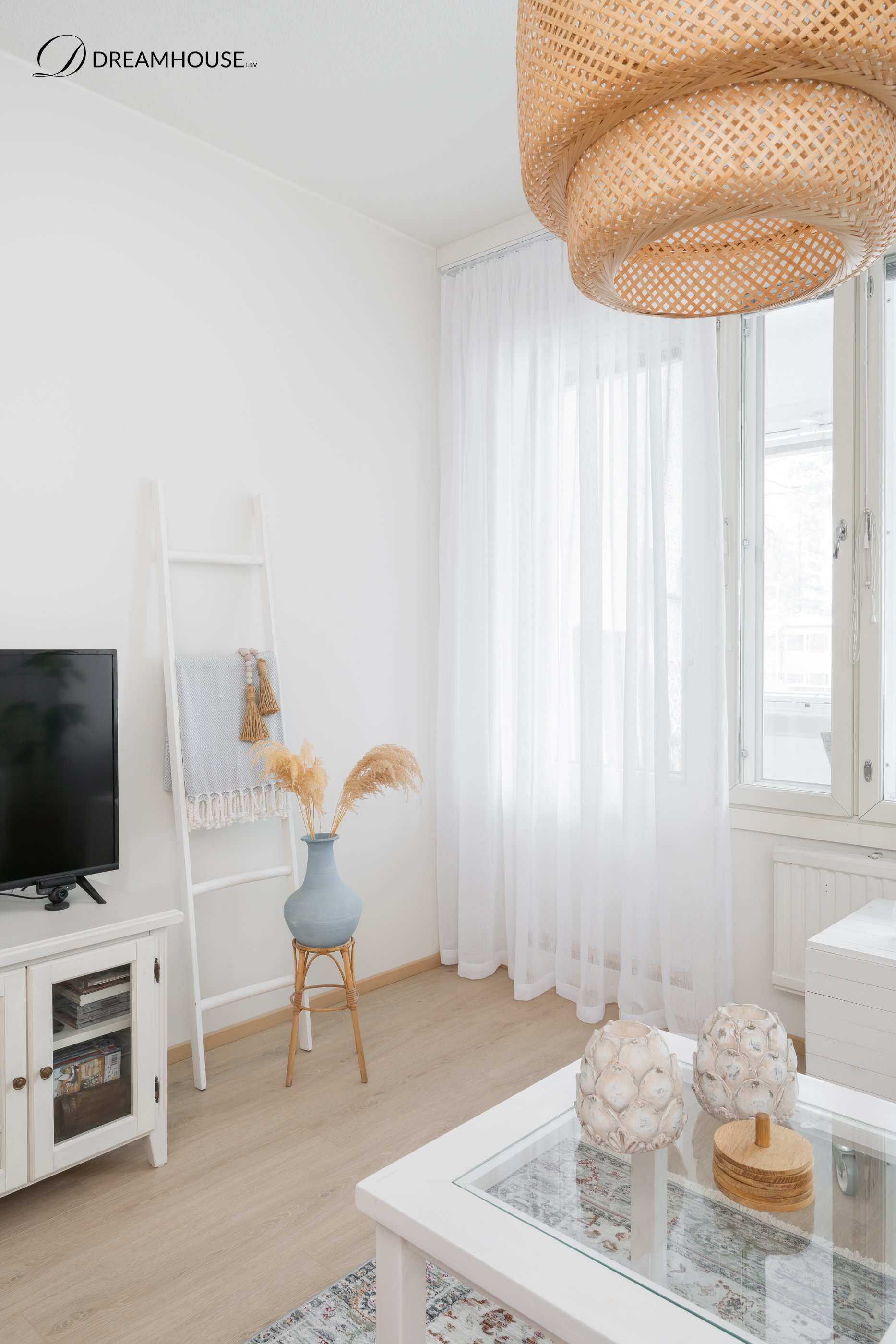 Rauhallinen päätyasunto talon ylimmässä kolmannessa kerroksessa, jossa valo kulkee kauniisti läpi huoneiston.