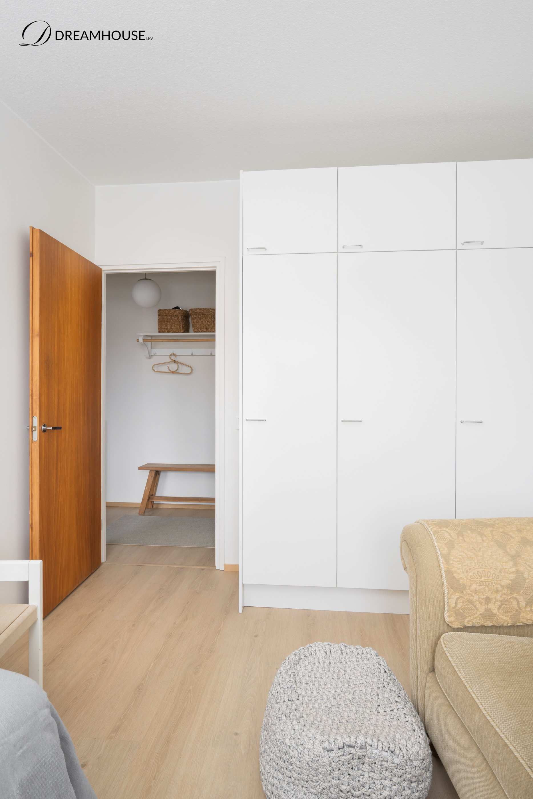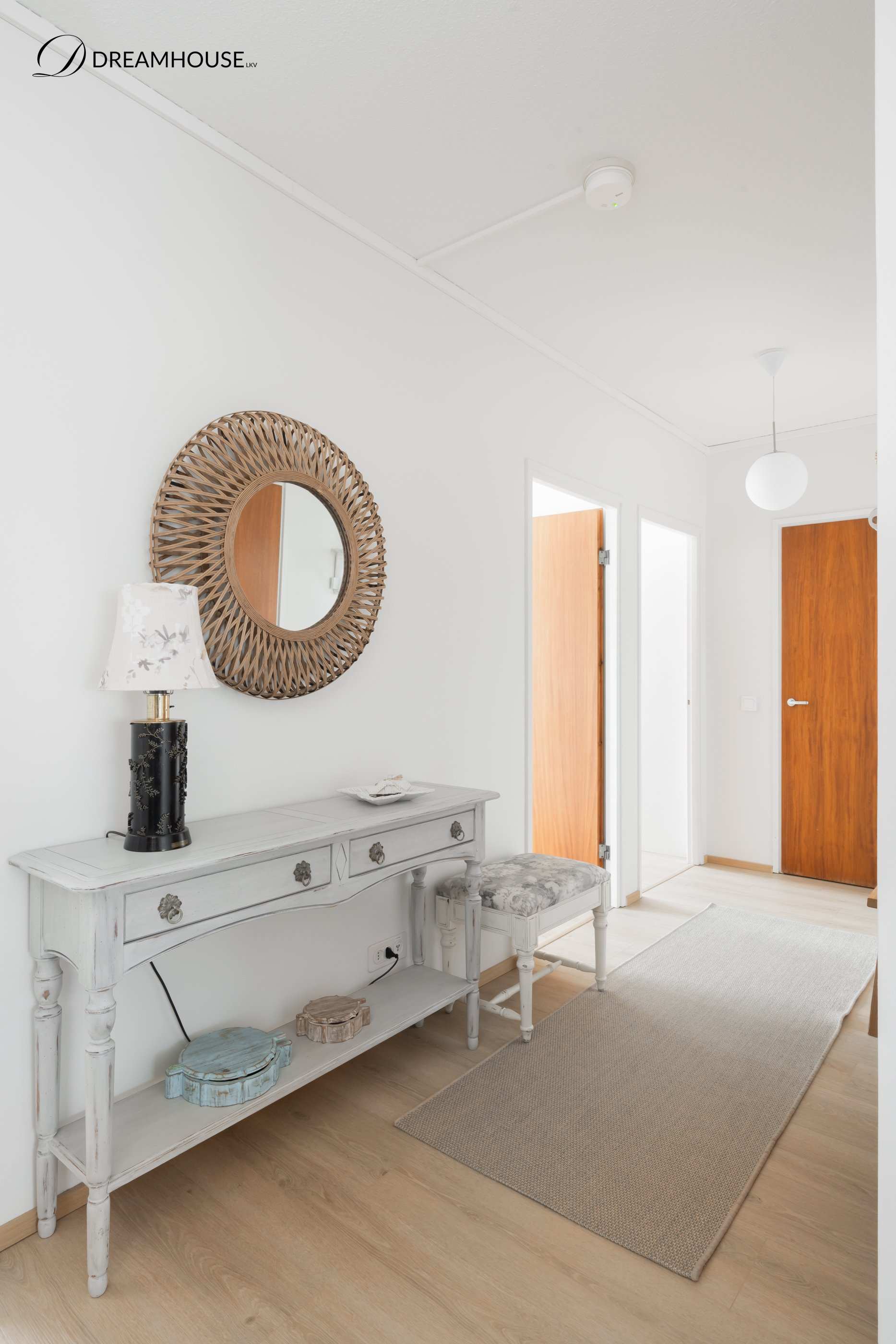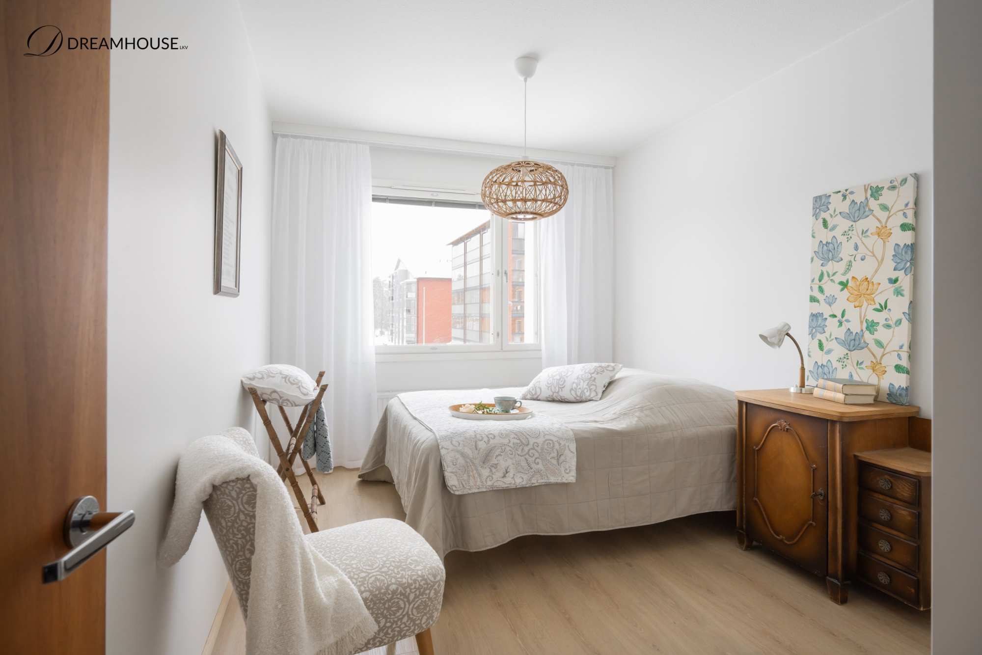 Rauhallinen päätyasunto talon ylimmässä kolmannessa kerroksessa, jossa valo kulkee kauniisti läpi huoneiston.