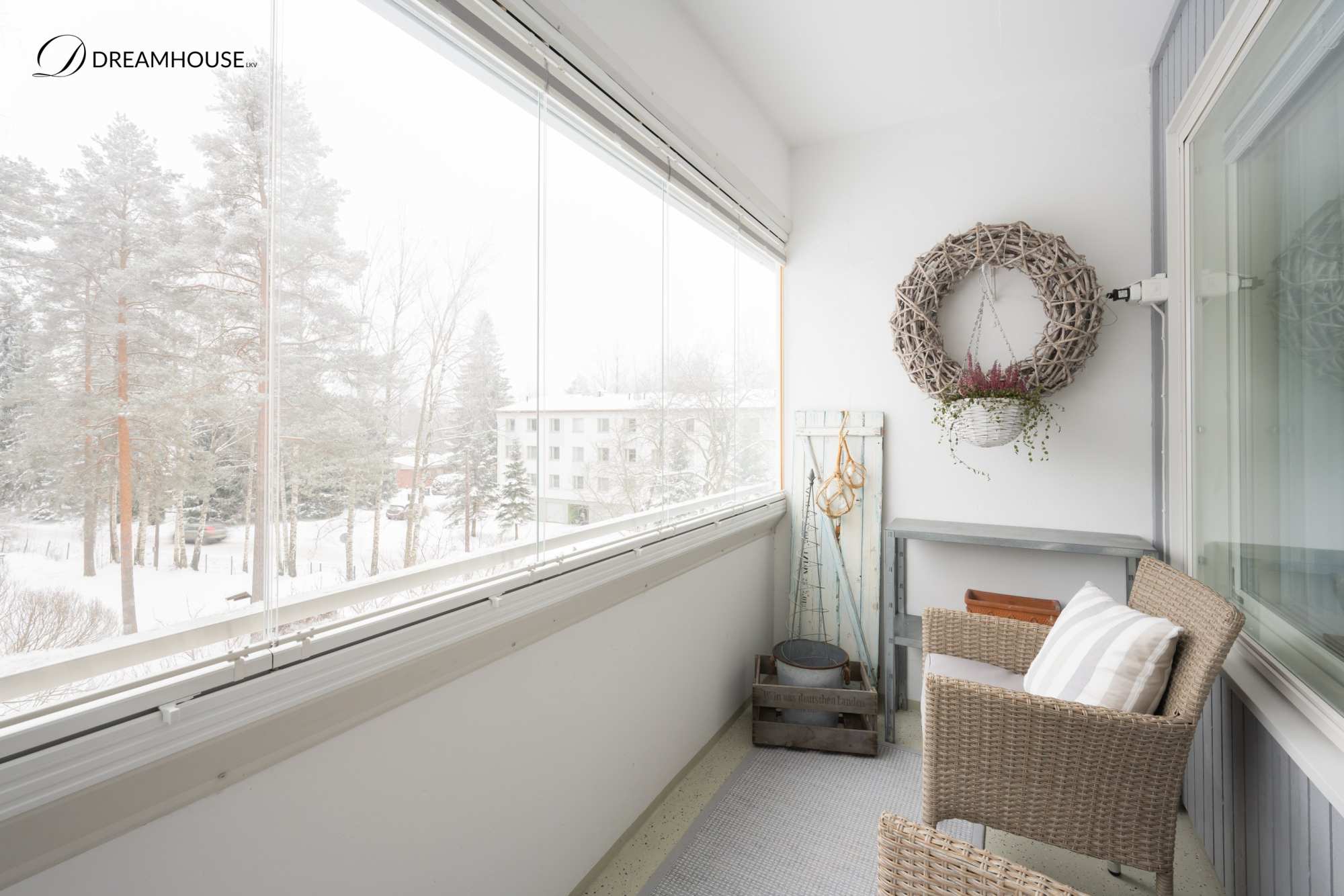 Asunnon kruunaa tilava lasitettu parveke, jolta avautuu väljä ja rauhoittava näkymä vehreälle pihalle. Parveekkeelta ei ole suoraa näköyhteyttä naapureihin, joten täällä voit nauttia ihanasti omasta rauhasta. Parveke tarjoaa viihtyisän lisätilan aikaisesta keväästä myöhäiseen syksyyn.
