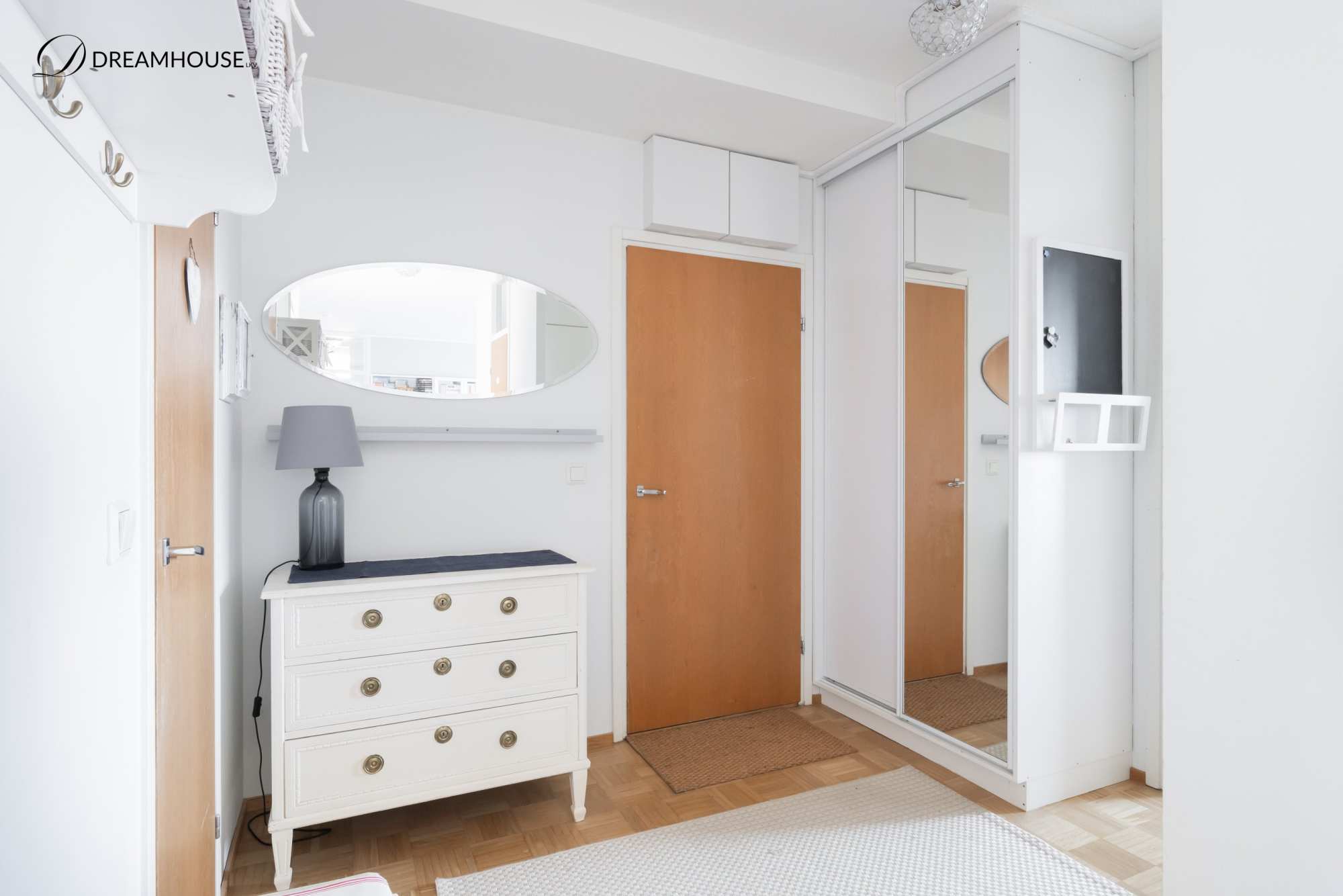 Eteinen on tilava ja siellä on säilytystilaa kaapistoissa sekä vaatehuoneessa. Sisääntulon vieressä on asunnon toinen kylpyhuone ja yksi makuuhuone. Valoisassa keittiössä on hyvin lasku- ja säilytystilaa. Keittiön vieressä on erillinen ruokailutila, josta saa tarvittaessa myös neljännen makuuhuoneen. Tilava kodinhoitohuone on sijoitettu kätevästi keittiön viereen.