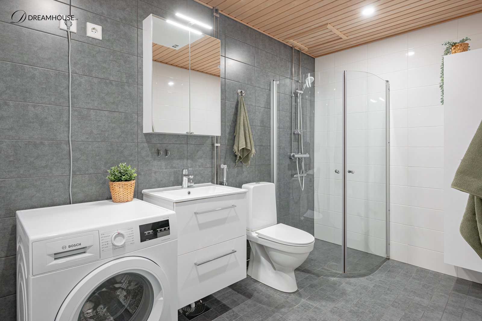 | Kylpyhuoneen varusteet | WC-istuin, suihku, suihkuseinä, pesukoneliitäntä, lattialämmitys, peilikaappi, pesuallas, allaskaappi, bidee-suihku ja kaappi |