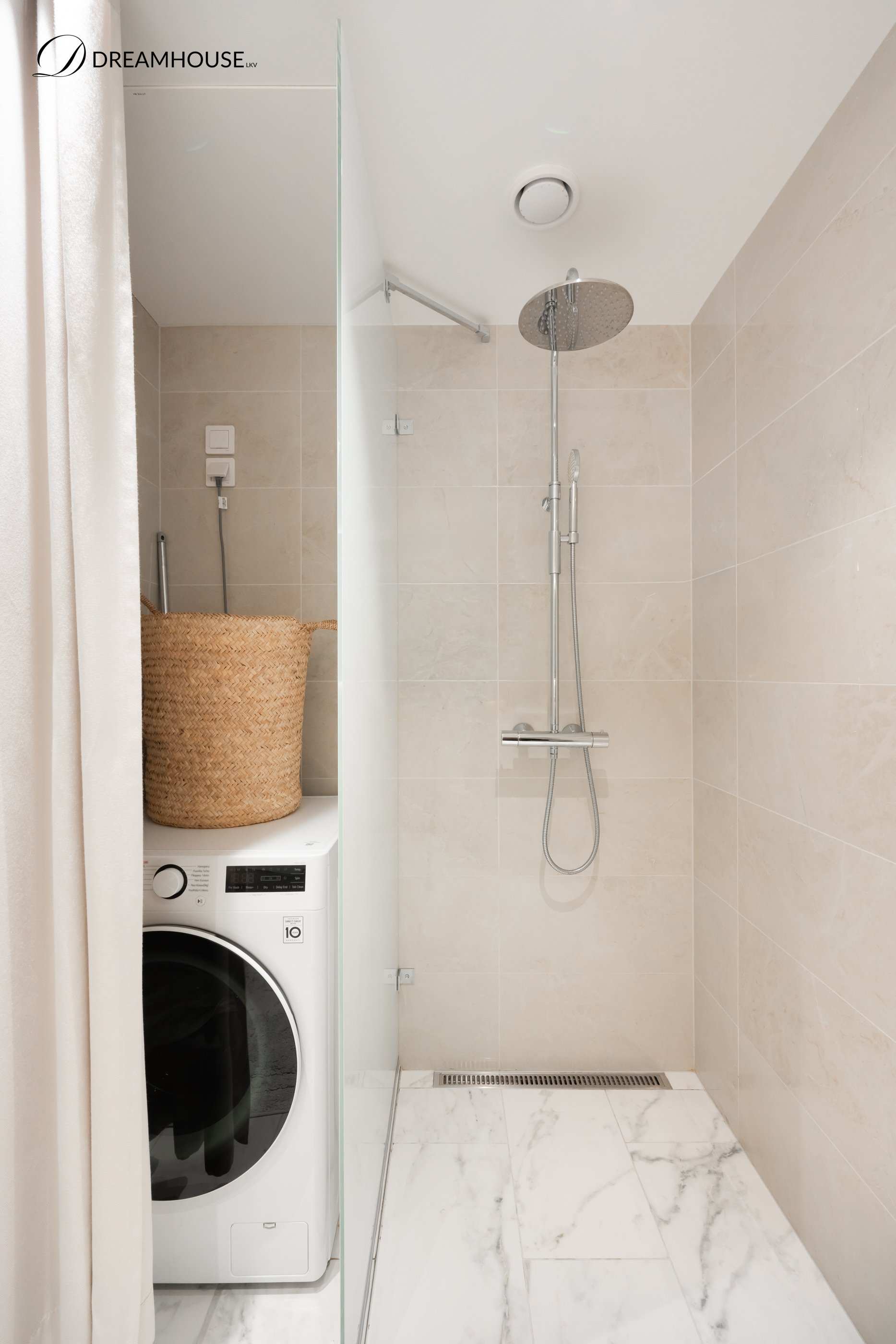| Kylpyhuoneen varusteet | WC-istuin, suihku, suihkuseinä, pesukoneliitäntä, peili, pesuallas, allaskaappi, bidee-suihku ja lattialämmitys |