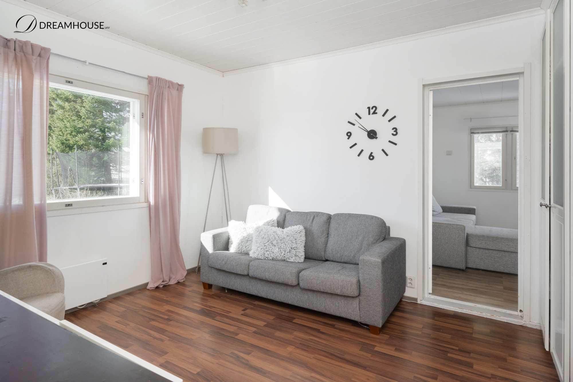 | Olohuoneen materiaalit | Lattia: Laminaatti Seinät: Tapetti |