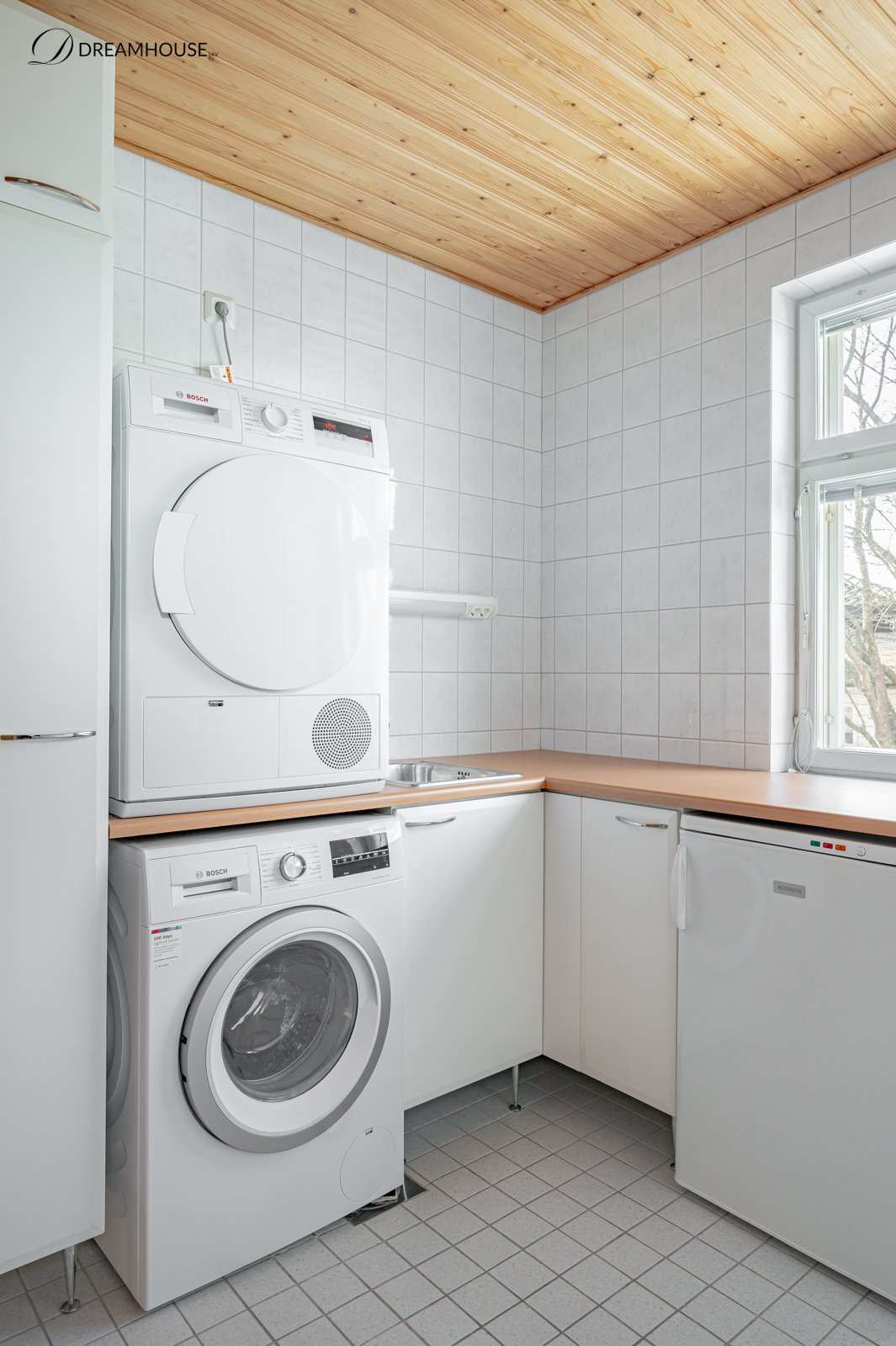 | Kodinhoitohuoneen varusteet | Lattialämmitys, pesukoneliitäntä, pesuallas, lattiakaivo, tila pesutornille ja pyykkikaapit |